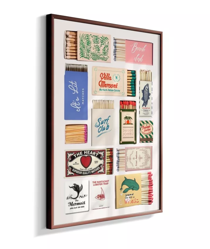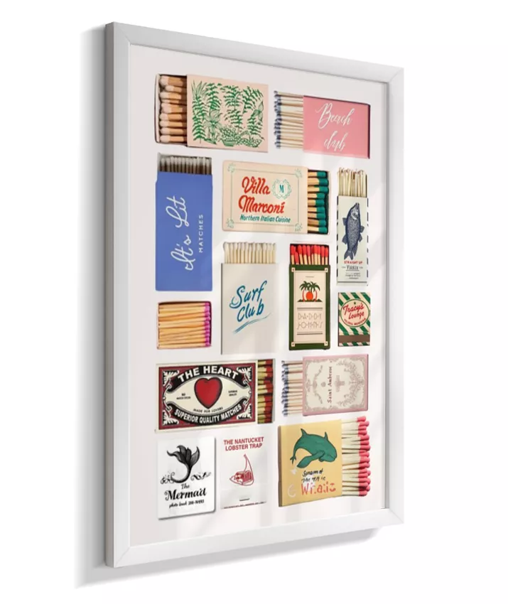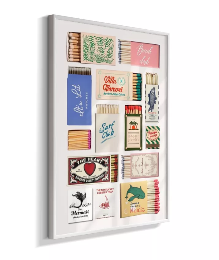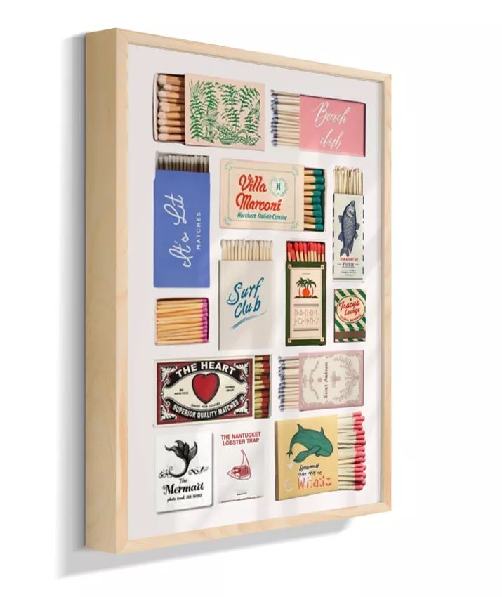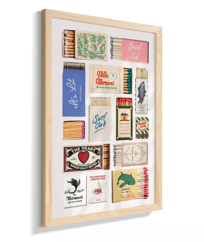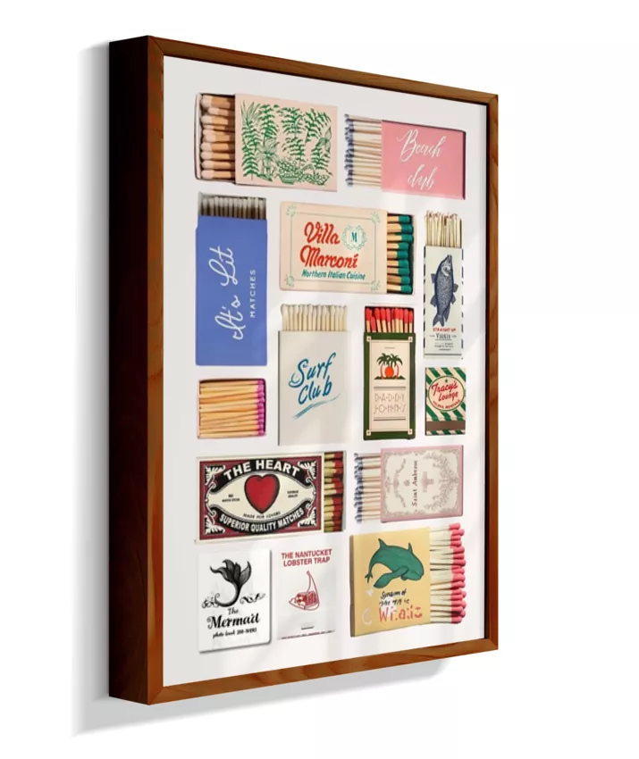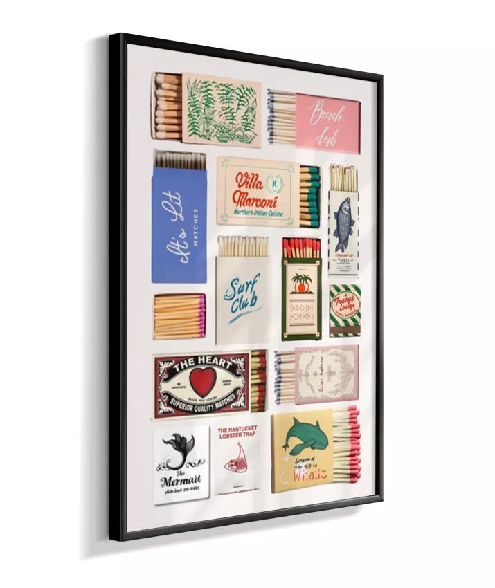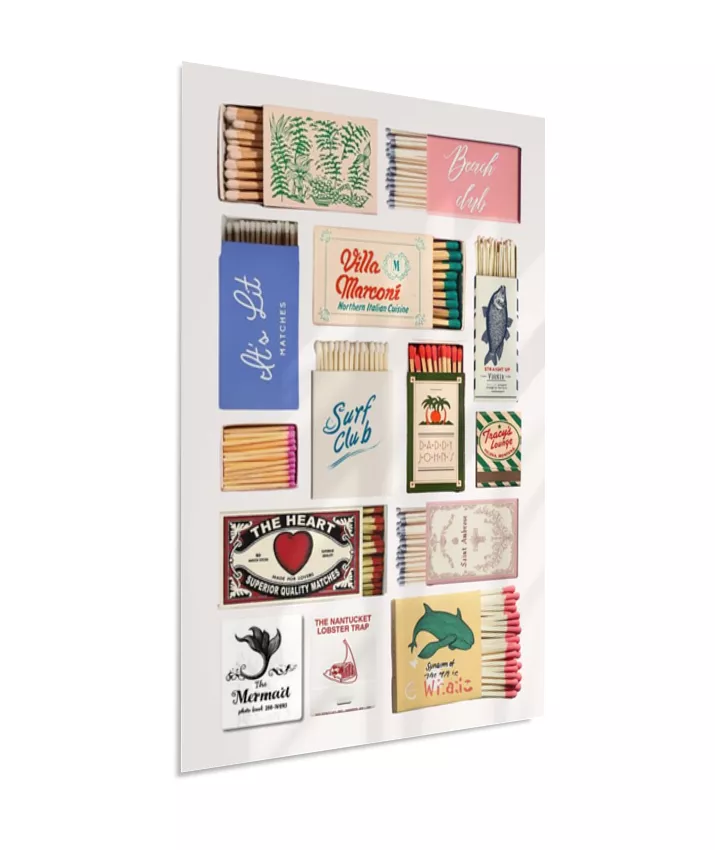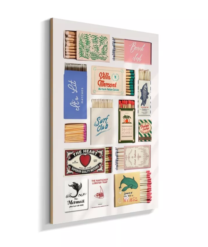 Matchbox é um quadro vibrante e divertido que mistura caixinhas de fósforo vintage, ingressos (tickets) retrô e elementos pop, com frases ousadas e cores vivas. Uma arte nostálgica com toque moderno, perfeita para ambientes criativos e cheios de personalidade.